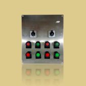 此次不銹鋼防爆操作柱面板安裝了4個(gè)燈、4個(gè)鈕和2個(gè)三檔開關(guān),三防操作柱佩帶合頁,打開檢修方便;
