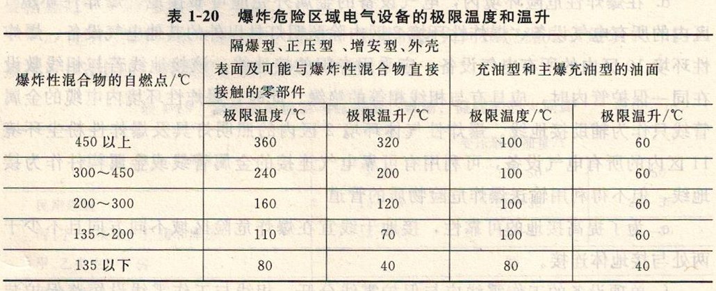 電氣設(shè)備運行中的電壓、電流、溫升等參數(shù)不得超過額定允許值,特別要注意線路的接頭和電氣設(shè)備進出線連接處的發(fā)熱情況。在有氣體或蒸氣爆炸性混合物的環(huán)境,電氣設(shè)備極限溫度和溫升應(yīng)符合表1-20的要求。在有粉塵或纖維爆炸性混合物的環(huán)境,電氣設(shè)備表面溫度一般不超過125°C。應(yīng)保持電氣設(shè)備清潔,尤其在纖維、粉塵爆炸性混合物環(huán)境的電氣設(shè)備,要經(jīng)常進行清掃,以免堆積的臟污和灰塵導(dǎo)致火災(zāi)危險。